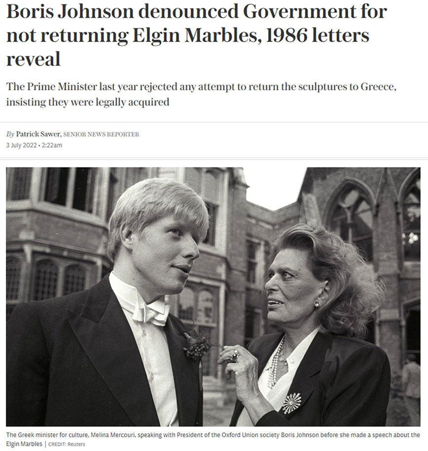 Η βρετανική Telegraph υπογραμμίζει και αποκαλύπτει στο βρετανικό κοινό την ασυνέπεια στη στάση του Βρετανού πρωθυπουργού, με αφορμή το δημοσίευμα των Νέων που φέρνει στο φως τις επιστολές του τότε νεαρού φοιτητή Μπόρις Τζόνσον προς τη Μελίνα Μερκούρη. Οι εν λόγω επιστολές του 1986 αποκαλύπτουν ότι ο Μπόρις Τζόνσον αποδοκίμαζε την απόφαση της κυβέρνησης να μην επιστρέψει τα Γλυπτά του Παρθενώνα.