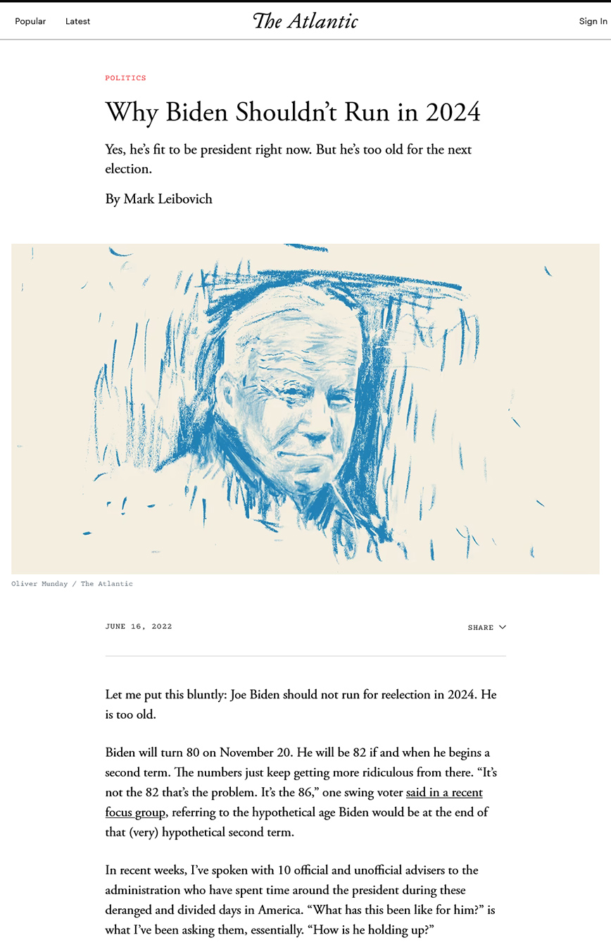 «Είναι σε θέση να ασκεί το αξίωμα του προέδρου σήμερα. Αλλά είναι πολύ γέρος για τις επόμενες εκλογές», ήταν το «χτύπημα» αρθρογράφου του περιοδικού The Atlantic στις 16 Ιουνίου, αν και το κείμενο ταυτόχρονα μαινόταν εναντίον των Ρεπουμπλικάνων που διατείνονται πως ο κ. Μπάιντεν έχει άνοια.