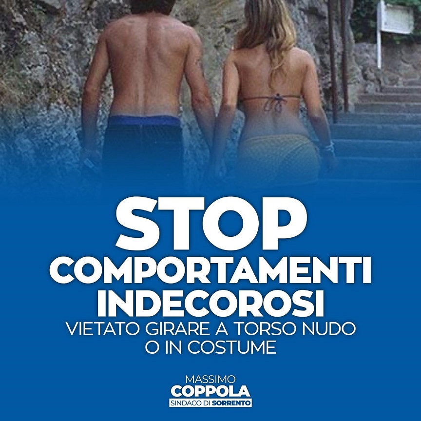 «Αυτοί οι τύποι συμπεριφορών μπορούν να θεωρηθούν ως αιτία ανησυχίας και δυσφορίας τόσο για τους κατοίκους του Σορέντο όσο και για τους τουρίστες», έγραψε επίσης ο Δήμαρχος που εμφανίζεται ενοχλημένος και να νιώθει άβολα με την αρκετή ποσότητα δέρματος που αφήνουν ακάλυπτη πάρα πολλοί και πρόσθεσε επίσης: