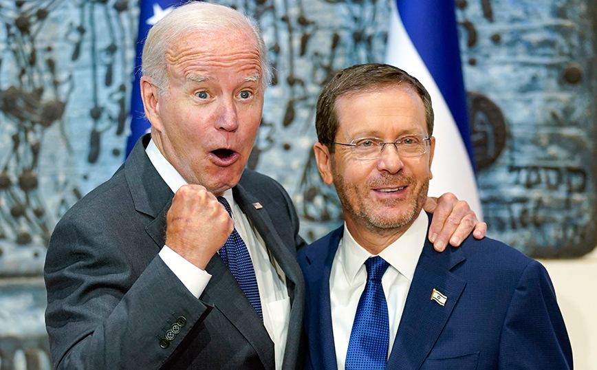 Ο πρόεδρος των ΗΠΑ, Τζο Μπάιντεν, σε μια παιδική, θα έλεγε κανείς, αντίδραση καθώς στέκεται μαζί με τον Ισραηλινό πρόεδρο Ισαάκ Χέρτζογκ στην κατοικία του Ισραηλινού στην Ιερουσαλήμ. Ο Τζο Μπάιντεν ταξίδεψε στην Ιερουσαλήμ στο πλαίσιο του πρώτου του ταξιδιού στη Μέση Ανατολή, σε μια πραγματική άσκηση ισορροπίας μεταξύ του Μεσανατολικού, της έντασης με το Ιράν και τις διαπραγματεύσεις με την πλούσια σε πετρέλαιο Σαουδική Αραβία.