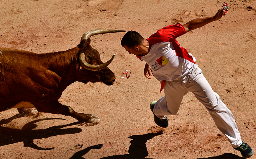 Ένας ταυρομάχος προσπαθεί να δαμάσει τον ταύρο κατά την διάρκεια του «Recortadores de Anillas» στο φεστιβάλ San Fermin στην Παμπλόνα στη βόρεια Ισπανία. Χιλιάδες κόσμου κάθε χρόνο συρρέει στην πόλη για να παρευρεθεί στο διάσημο φεστιβάλ της πόλης, το οποίο είχε ανασταλεί τα τελευταία δύο χρόνια λόγω της πανδημίας του κορονοϊού.