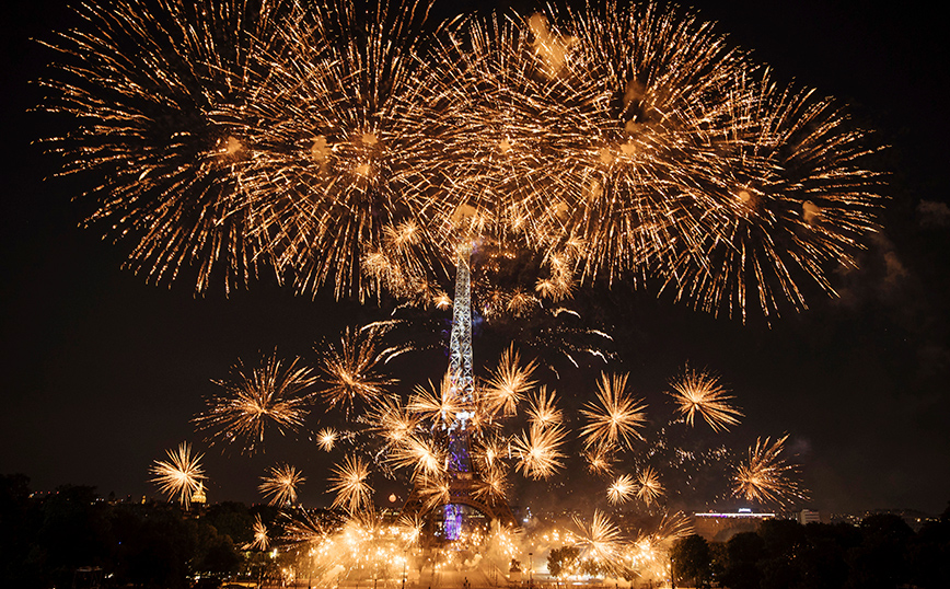 Πυροτεχνήματα φωτίζουν τον Πύργο του Άιφελ στο Παρίσι κατά τη διάρκεια του εορτασμού της Ημέρας της Βαστίλης. Πρόκειται για μια πολύ σημαντική ημέρα στο Παρίσι, αλλά και σε ολόκληρη τη Γαλλία. Η ετήσια στρατιωτική παρέλαση στα Ηλύσια Πεδία ξεκίνησε από την Αψίδα του Θριάμβου και κατέληξε στην Place de la Concorde.