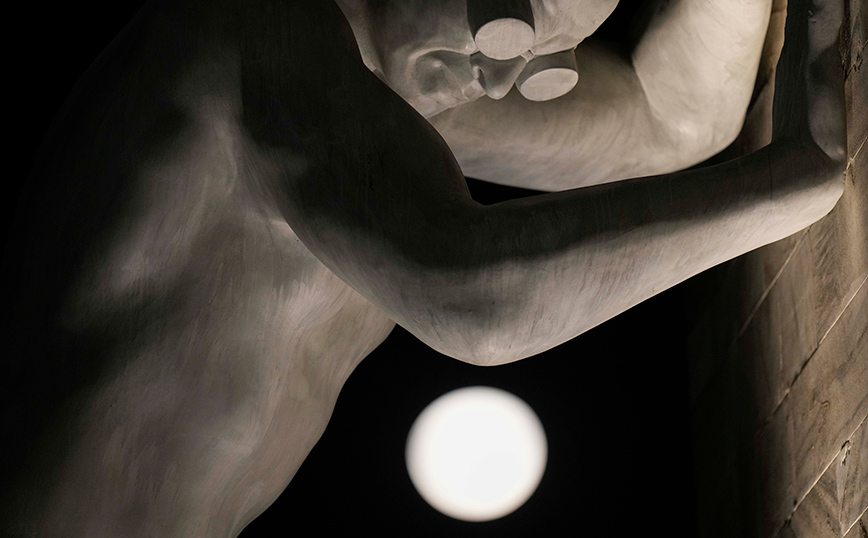 Η πανσέληνος του Ιουλίου ανατέλλει πάνω από το γλυπτό «Mr Arbitrium» του Ιταλού καλλιτέχνη Emanuele Giannelli που ακουμπά στην Αψίδα της Ειρήνης. Η πανσέληνος, γνωστή και ως το «Φεγγάρι του Ελαφιού» ή υπερπανσέληνος, πρόσφερε στον κόσμο ανά τον πλανήτη μοναδικά, φωτογραφικά κλικ.