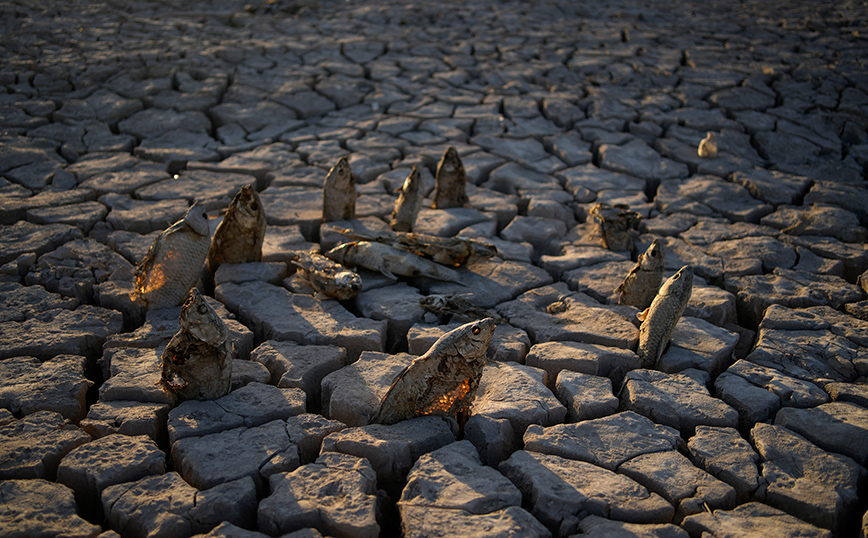 Νεκρά και αποξηραμένα ψάρια που τοποθετήθηκαν από έναν επισκέπτη της Εθνικής Περιοχής Αναψυχής Lake Mead μοιάζουν να «αναδύονται» από την αποξηραμένη γη, κοντά στο Boulder City, στη Νεβάδα. Η περιοχή, που κάποτε βρισκόταν κάτω από τα νερά της λίμνης Mead, αποξηράνθηκε καθώς η στάθμη του νερού έπεσε.