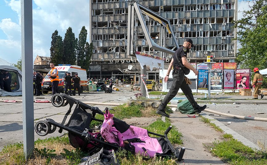Ρωσικά στρατεύματα εξαπέλυσαν επίθεση με ρουκέτες στο κέντρο της Βινίτσια -τρεις ρουκέτες έπληξαν κτίριο με χώρους γραφείων, το Σπίτι των Αξιωματικών, ενώ και κοντινά κτίρια κατοικιών υπέστησαν, επίσης, ζημιές. Σε μία από τις πιο τραγικές επιθέσεις από την έναρξη της ρωσικής εισβολής, περίπου 50 αυτοκίνητα πήραν φωτιά στο σημείο της πρόσκρουσης, ενώ ανάμεσα στα θύματα και μικρά παιδιά. Όπως και το κοριτσάκι που βρισκόταν στο καρότσι της φωτογραφίας και είχε βγει βόλτα με την μητέρα του, λίγο πριν την επίθεση.