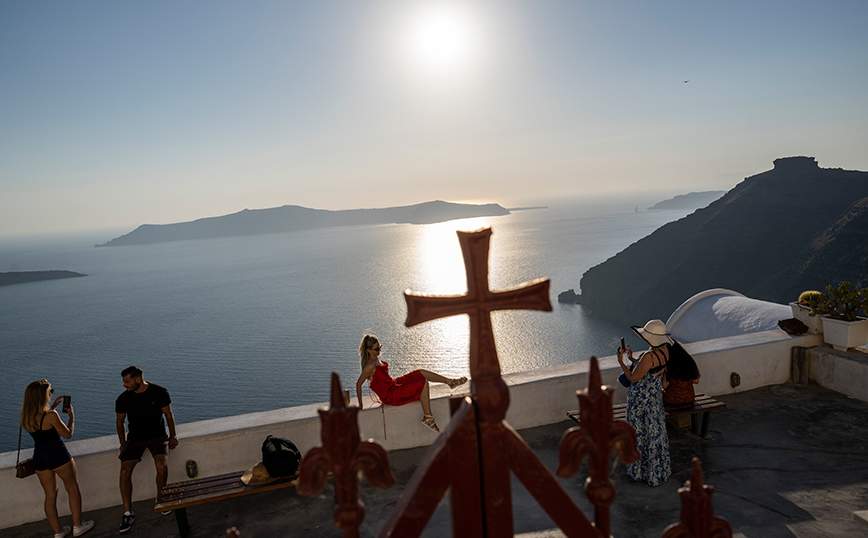 Το διασημότερο ηλιοβασίλεμα της Ελλάδας, αυτό της Σαντορίνης, κάθε χρόνο προσελκύει χιλιάδες τουρίστες στο ηφαιστειογενές νησί των Κυκλάδων. Εδώ, μια γυναίκα ποζάρει για μια φωτογραφία με φόντο το ηλιοβασίλεμα, έξω από τον σφυρήλατο σιδερένιο περίβολο της Καθολικής Εκκλησίας Κοιμήσεως της Θεοτόκου, την Τετάρτη 15 Ιουνίου 2022. Το μοναστήρι της Αγίας Αικατερίνης φιλοξενεί περισσότερες από δώδεκα μοναχές.