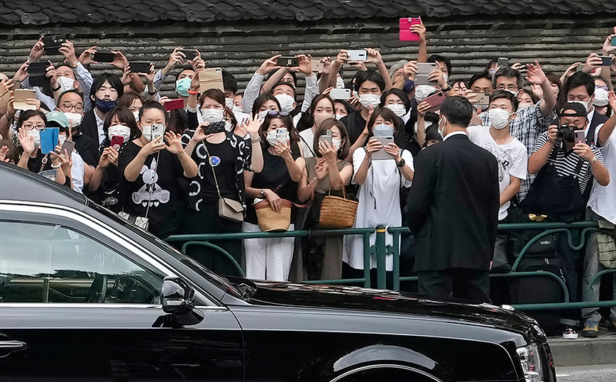 Κάτοικοι του Τόκιο αποχαιρετούν τη νεκροφόρα που μεταφέρει τη σορό του πρώην πρωθυπουργού της Ιαπωνίας Σίνζο Άμπε καθώς φεύγει από το ναό Zojoji μετά την κηδεία του. Ο Άμπε δολοφονήθηκε την προηγούμενη Παρασκευή, με τον δράστη να τον πυροβολεί πισώπλατα κατά την διάρκεια της προεκλογικής εκστρατείας του στη Νάρα, στη δυτική Ιαπωνία.