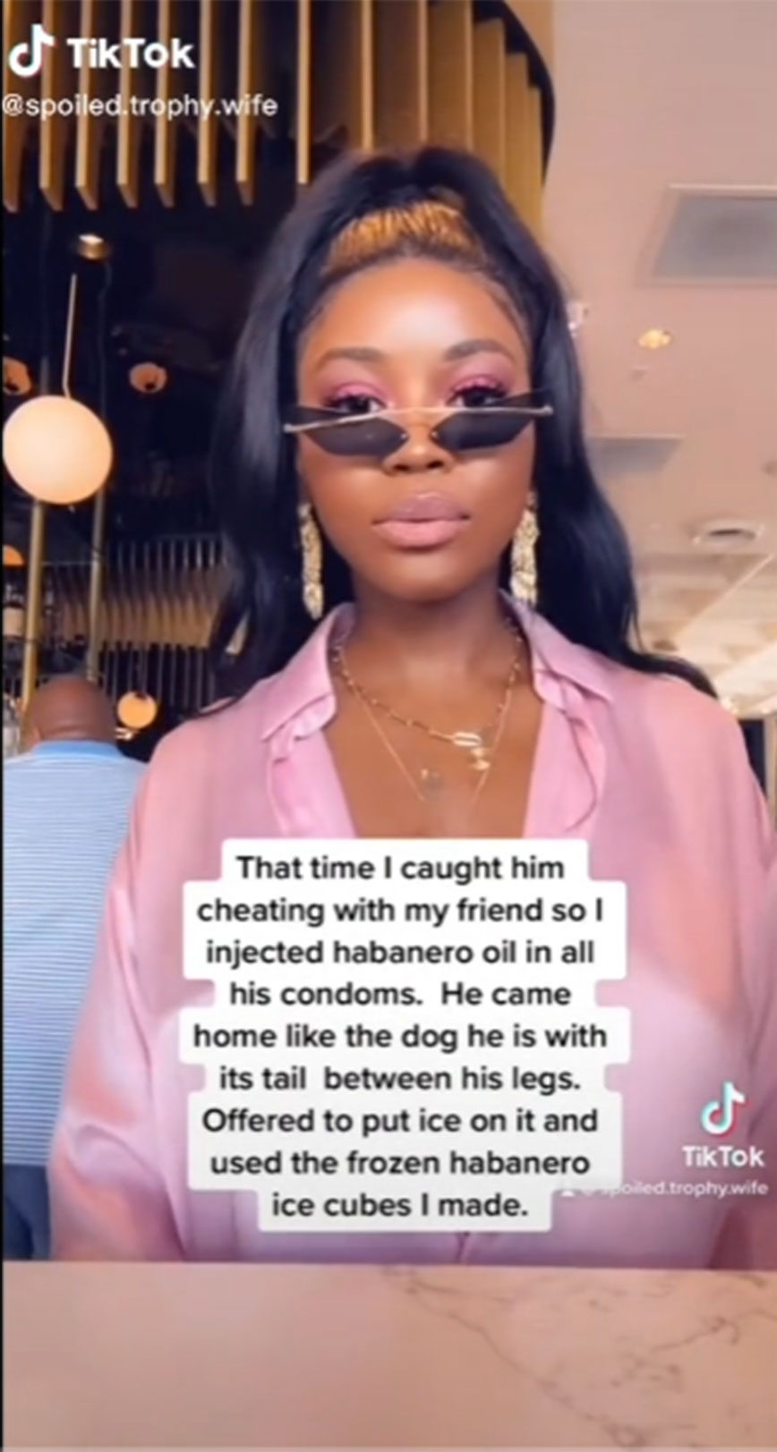 Το σχέδιο εκδίκησης αμέσως μπήκε σε εφαρμογή, με την ίδια να κάνει ένεση με σάλτσα τσίλι στα προφυλακτικά του συντρόφου της, χωρίς αυτός να έχει υποψιαστεί κάτι. Μια μέρα λοιπόν, γύρισε σπίτι και κρατούσε με μανία τα γεννητικά του όργανα, φωνάζοντας ότι καίγεται. Όταν εκείνη τον ρώτησε τι έγινε, αυτός απάντησε ότι έβαλε μια λοσιόν για να μυρίζει καλύτερα, μετά το μπάνιο που έκανε στο γυμναστήριο.