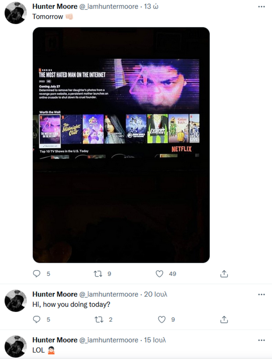 «Όλα ξεκίνησαν από το μίσος μου για μια γυναίκα που μου ράγισε την καρδιά», γελάει ο Μουρ, ο οποίος ίδρυσε την ιστοσελίδα στα 26 του, σε ηχητικό που παρουσιάζεται στο ντοκιμαντέρ. (Δεν συμμετείχε στο ντοκιμαντέρ ούτε απάντησε στο αίτημα της The Post για σχολιασμό). «Εγώ και οι φίλοι μου απλά δημοσιεύαμε ένα σωρό κορίτσια στο IsAnyoneUp, και μια μέρα είχαμε μεγάλη επισκεψιμότητα. Και σκέφτηκα: “Μπορώ να βγάλω λεφτά από αυτά και να κοροϊδέψω τους ανθρώπους”».
