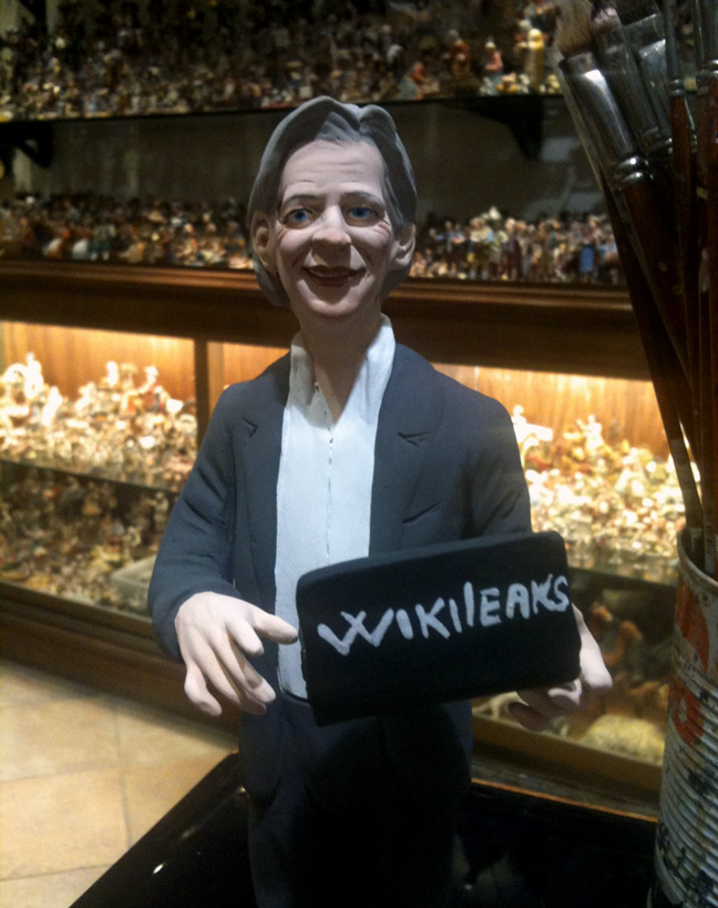 Κατασκευασμένος από τον Ναπολιτάνο καλλιτέχνη Gennaro Di Virgilio, ο Ασανζ απεικονίζεται σε μινιατούρα να κρατά το λαπ τοπ του όπου αναγράφεται η λέξη WikiLeaks.