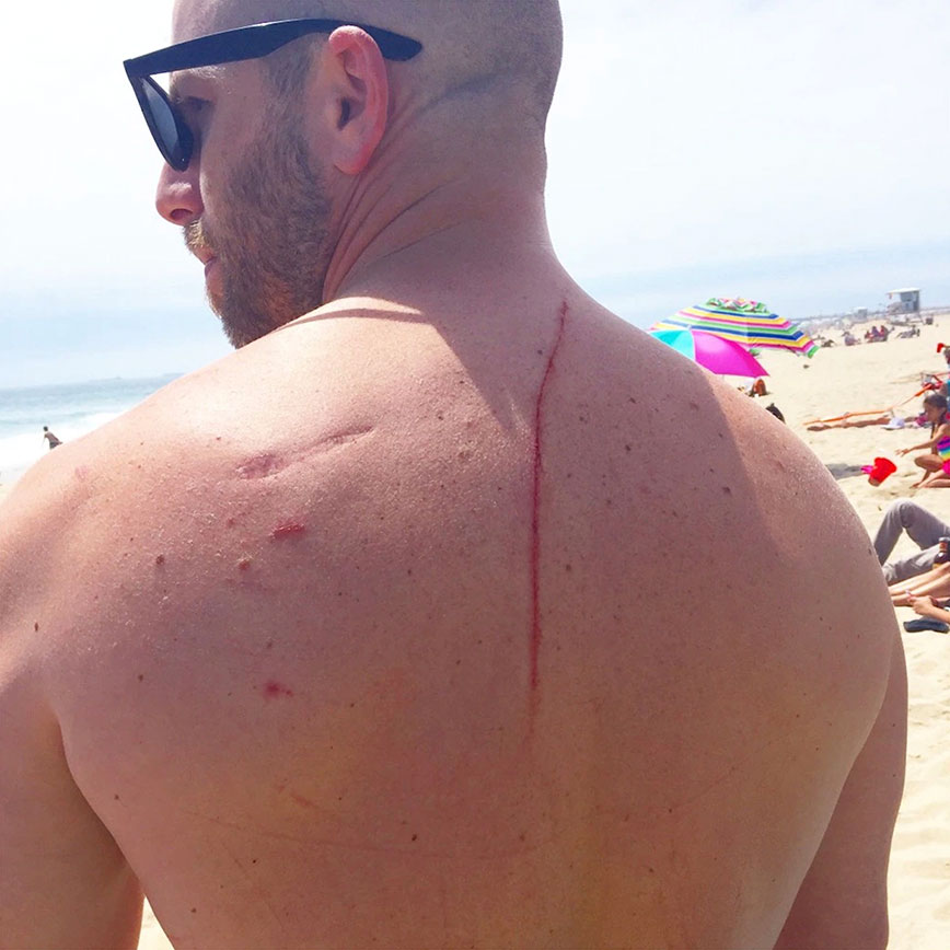 Έτσι, κολύμπησε μέχρι την στεριά και όταν βγήκε έξω, η κόρη του διαπίστωσε ότι αιμορραγούσε έντονα από την πλάτη του και εκείνος παρατήσε πως είχε ένα κάθετο κόψιμο περίπου 30 εκατοστά.