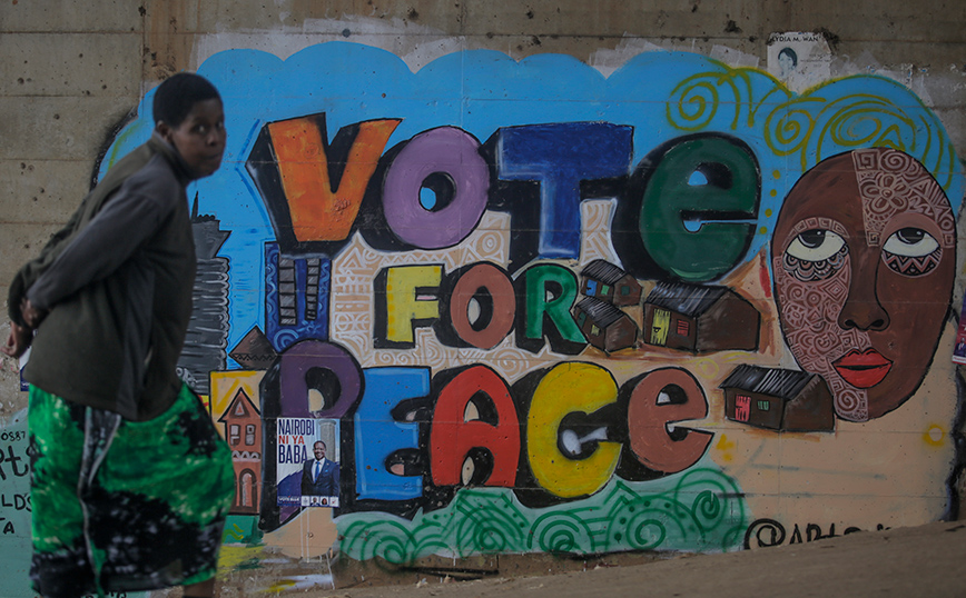 Μια γυναίκα περπατά μπροστά από μια εκλογική τοιχογραφία που καλεί για ειρήνη, στη φτωχογειτονιά Kibera του Ναϊρόμπι, στην Κένυα. Η Κένυα έχει προγραμματίσει τις γενικές εκλογές της την Τρίτη 9 Αυγούστου, καθώς ο οικονομικός κόμβος της Ανατολικής Αφρικής επιλέγει τον διάδοχο του προέδρου Ουχούρου Κενυάτα.