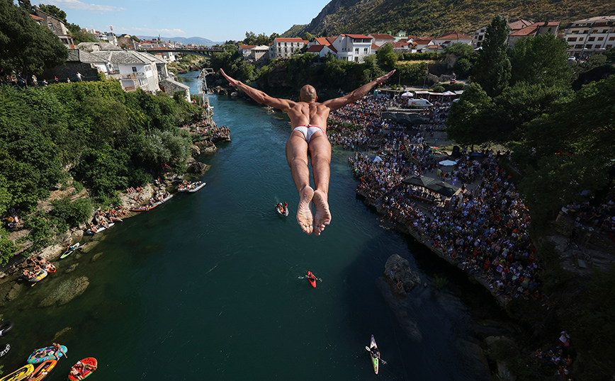 Ένας δύτης πηδάει από την Παλιά Γέφυρα κατά τη διάρκεια του 456ου παραδοσιακού ετήσιου διαγωνισμού καταδύσεων στο Μόσταρ της Βοσνίας. Συνολικά 31 δύτες από τη Βοσνία και την ευρύτερη περιοχή πήδηξαν από τη γέφυρα ύψους 23 μέτρων στον ποταμό Νερέτβα.