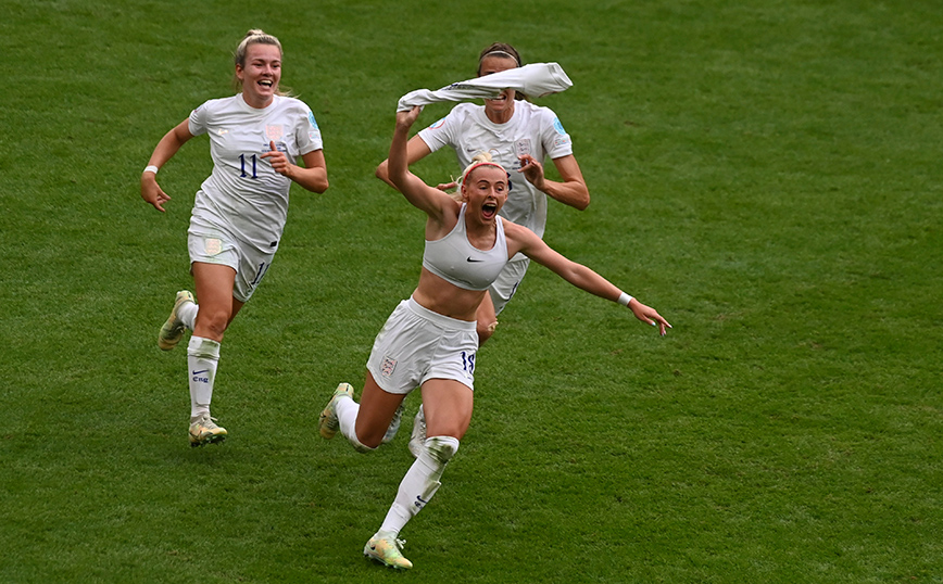 Η Αγγλίδα Chloe Kelly, στο κέντρο, πανηγυρίζει αφού πέτυχε το δεύτερο γκολ της ομάδας της κατά τη διάρκεια του τελικού αγώνα ποδοσφαίρου του Euro 2022 γυναικών μεταξύ της Αγγλίας και της Γερμανίας στο στάδιο Γουέμπλεϊ στο Λονδίνο. Οι «λέαινες» ήταν εξαρχής ένα από τα φαβορί για την κατάκτηση του Euro Γυναικών 2022 και τελικά επιβεβαίωσαν τα προγνωστικά, αφού έκαναν δικό τους το τρόπαιο με το 2- 1 επί της Γερμανίας.