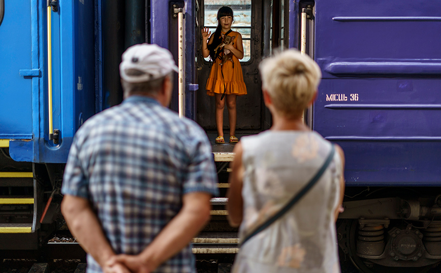 Ένα μικρό κοριτσάκι με το σκυλάκι της αγκαλιά χαιρετά τους παππούδες της από ένα τρένο εκκένωσης που αναχωρεί από το Ποκρόβσκ, στην περιοχή Ντονέτσκ, στην ανατολική Ουκρανία για ένα ασφαλέστερο τμήμα της χώρας στα δυτικά. Η κυβέρνηση έδωσε εντολή στους κατοίκους να εγκαταλείψουν την περιοχή του Ντονέτσκ ενόψει της ρωσικής επίθεσης, καθώς προετοιμάζονται για το φθινόπωρο και τον χειμώνα και φοβούνται ότι πολλοί εκεί δεν θα έχουν πρόσβαση σε θέρμανση, ηλεκτρικό ρεύμα ή ακόμη και καθαρό νερό.