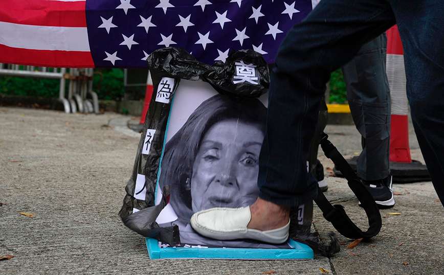 Υποστηρικτές υπέρ της Κίνας πατούν πάνω σε μια εικόνα της προέδρου της αμερικανικής Βουλής των Αντιπροσώπων Νάνσι Πελόζι κατά τη διάρκεια διαμαρτυρίας έξω από το Γενικό Προξενείο των Ηνωμένων Πολιτειών στο Χονγκ Κονγκ. Η Πελόζι έφθασε στην Ταϊβάν αργά την Τρίτη, αποτελώντας την πιο υψηλόβαθμη Αμερικανίδα αξιωματούχο των τελευταίων 25 ετών που επισκέπτεται το αυτοδιοικούμενο νησί που διεκδικεί η Κίνα, η οποία πραγματοποίησε στρατιωτικές ασκήσεις σε αντίποινα για την παρουσία της.