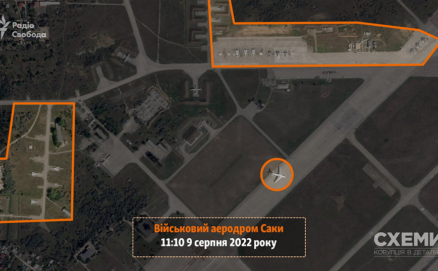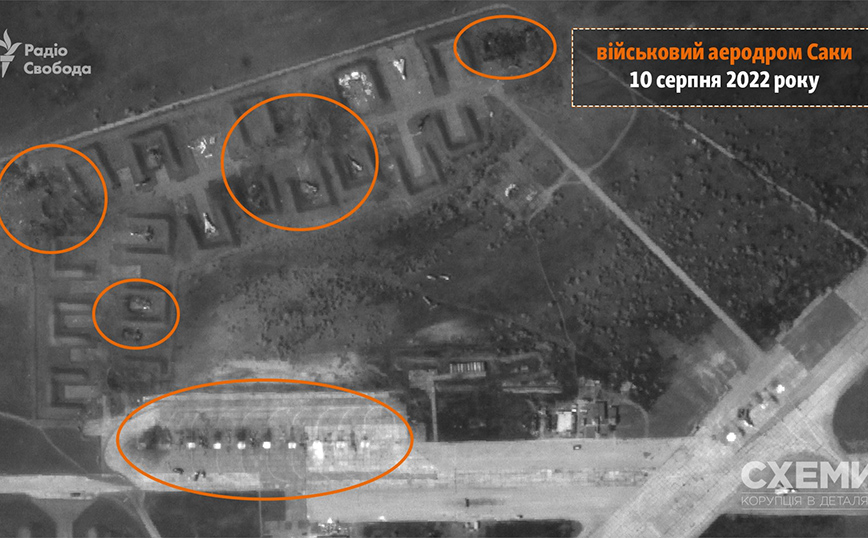 Οι φωτογραφίες, που δόθηκαν στη δημοσιότητα από την ανεξάρτητη εταιρεία δορυφόρων Planet Labs, εικονίζουν τρεις σχεδόν όμοιους κρατήρες στα σημεία όπου επλήγησαν με ακρίβεια κτίρια στη ρωσική αεροπορική βάση Σάκι. Η βάση, στη νοτιοδυτική ακτή της Κριμαίας, υπέστη εκτεταμένες ζημιές από πυρκαγιά και είναι ξεκάθαρα ορατά τουλάχιστον οκτώ κατεστραμμένα αεροπλάνα.