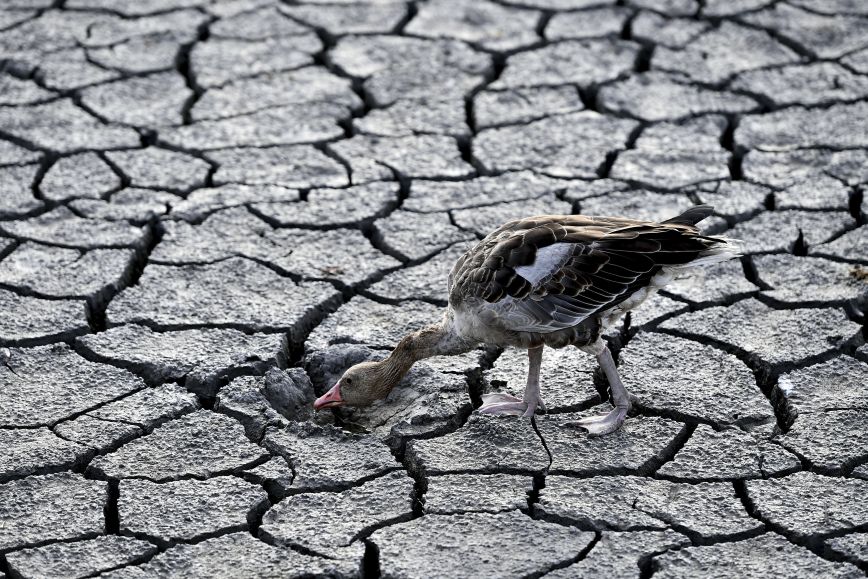 Μια χήνα ψάχνει για λίγο νερό στην αποξηραμένη κοίτη της λίμνης Βελέντσε της Ουγγαρίας την Πέμπτη 11 Αυγούστου 2022. Η ξηρασία σαρώνει την Ευρώπη και η Ουγγαρία δεν θα μπορούσε να μείνει ανεπηρέαστη. Η λίμνη Βελέντσε είναι η τρίτη μεγαλύτερη φυσική λίμνη στην Ουγγαρία. Σύμφωνα με τη Γενική Διεύθυνση Διαχείρισης Υδάτων (OVF), η στάθμη του νερού στη λίμνη βρίσκεται στο χαμηλότερο επίπεδο που έχει καταγραφεί ποτέ.