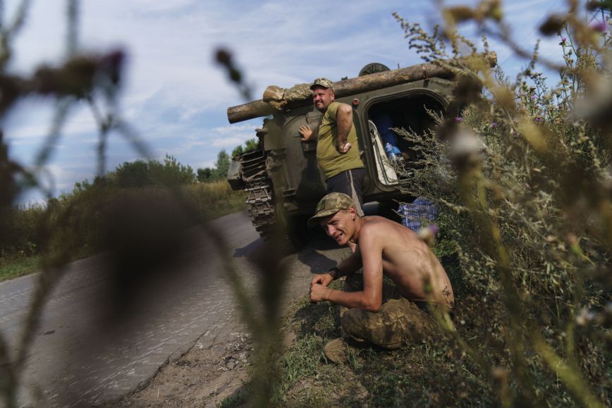 Ουκρανοί στρατιώτες βγήκαν έξω από το τανκ τους και περιμένουν υπομονετικά στην άκρη του δρόμου για βοήθεια λίγη ώρα αφού το βαρύ όχημα αντιμετώπισε μηχανικά προβλήματα σε επαρχιακό δρόμο κοντά στο Κραματόρσκ στην περιοχή Ντονέτσκ της ανατολικής Ουκρανίας την Τετάρτη, 10 Αυγούστου 2022.