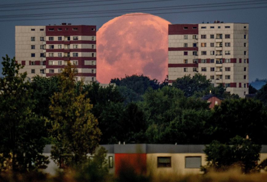 Η υπερπανσέληνος του Αυγούστου χαρίζει ένα απολαυστικό και μαγικό θέαμα καθώς «αναδύεται» πίσω από πολυκατοικίες στα περίχωρα της Φρανκφούρτης στη Γερμανία, την Παρασκευή, 12 Αυγούστου 2022.