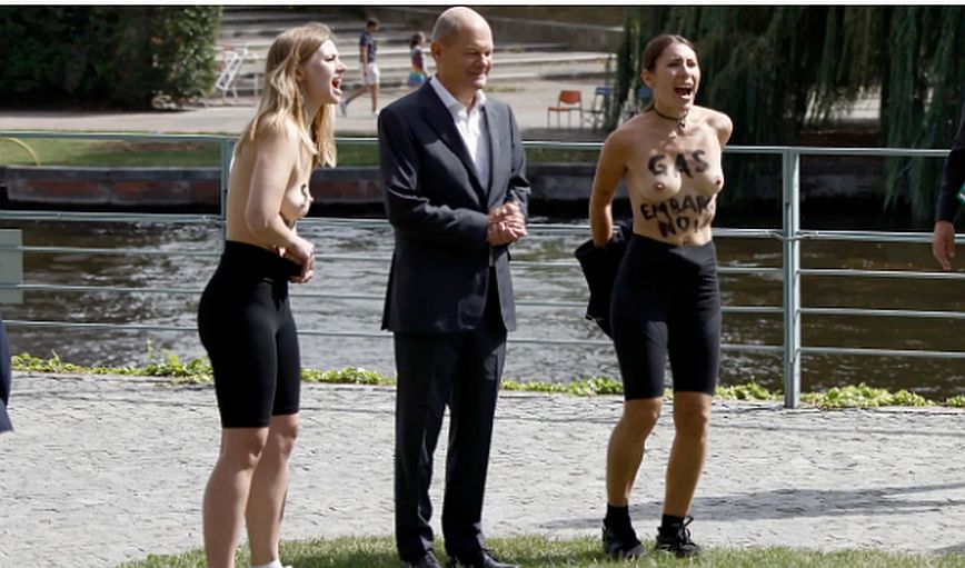 Δύο ακτιβίστριες αιφνιδίασαν τον καγκελάριο της Γερμανίας Όλαφ Σολτς, με τον οποίο ζήτησαν να φωτογραφηθούν, καθώς γύμνωσαν τα στήθη τους απαιτώντας «εμπάργκο στο ρωσικό φυσικό αέριο, τώρα», λόγω της εισβολής της Ρωσίας στην Ουκρανία.