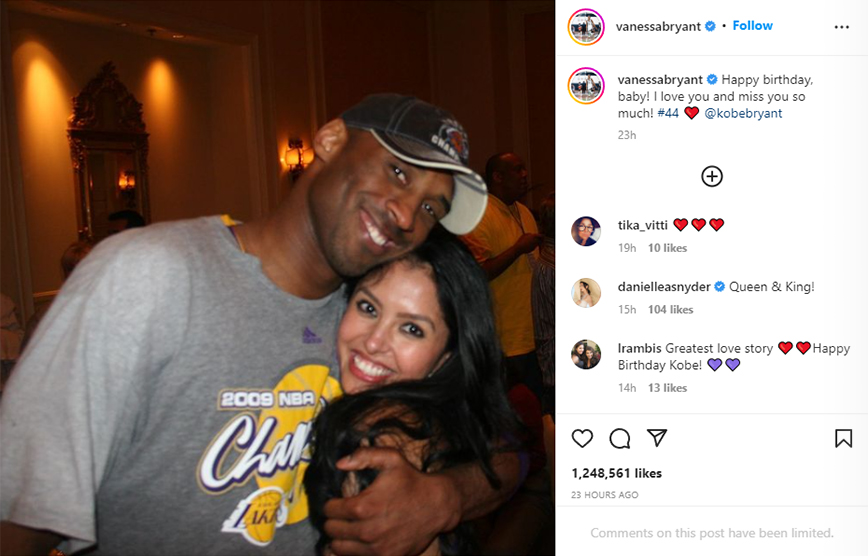 Δύο χρόνια μετά το τραγικό δυστύχημα που του στέρησε τη ζωή, η σύζυγός του, Βανέσα Μπράιαντ, ανέβασε μια φωτογραφία μαζί με τον Κόμπι από το 2009, όταν ο Κομπι Μπράιαντ κέρδισε τον 4ο τίτλο του στο ΝΒΑ και τον 1ο MVP στους τελικούς. «Χρόνια πολλά μωρό μου. Σε αγαπώ και μου λείπεις τόσο πολύ» γράφει η Βανέσα.