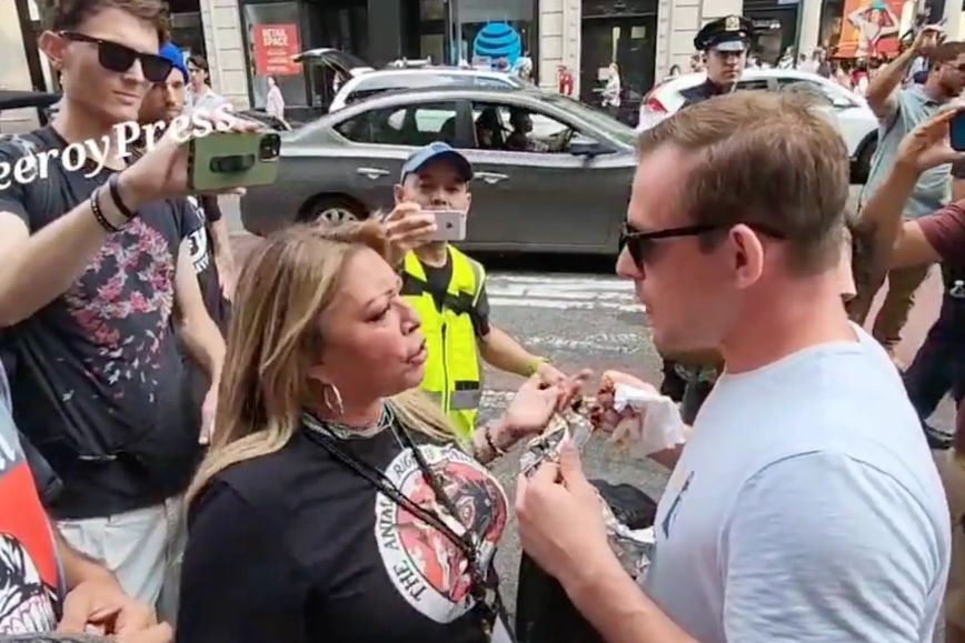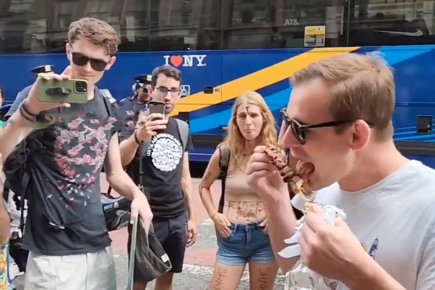 Viral έχει γίνει ένα βίντεο που δείχνει ακτιβιστές για τα δικαιώματα των ζώων να ουρλιάζουν μπροστά σε έναν άντρα που τρώει σις κεμπάπ μπροστά τους, την ώρα μιας διαδήλωσης στην πόλη της Νέας Υόρκης.