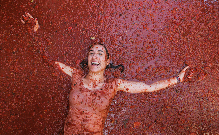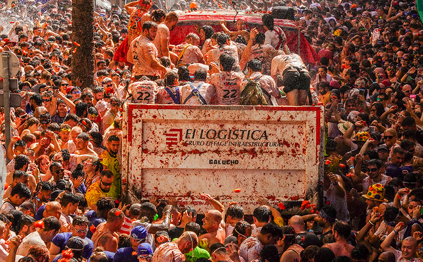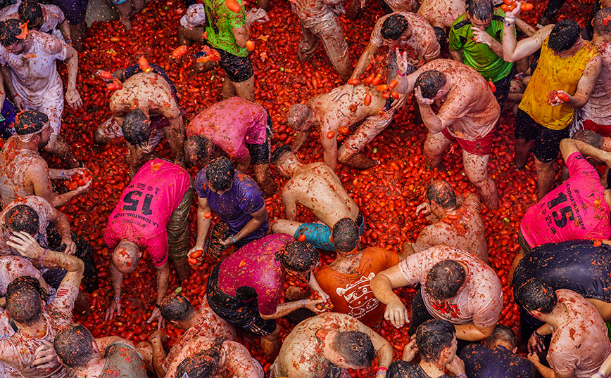 Έξι φορτηγά με υπερώριμες ντομάτες κυκλοφορούσαν στους στενούς δρόμους της Μπουνόλ και μοίραζαν τα οπωροκηπευτικά στους παρευρισκόμενους, που γέμισαν τους δρόμους, και τους ίδιους με τον κόκκινο πολτό.