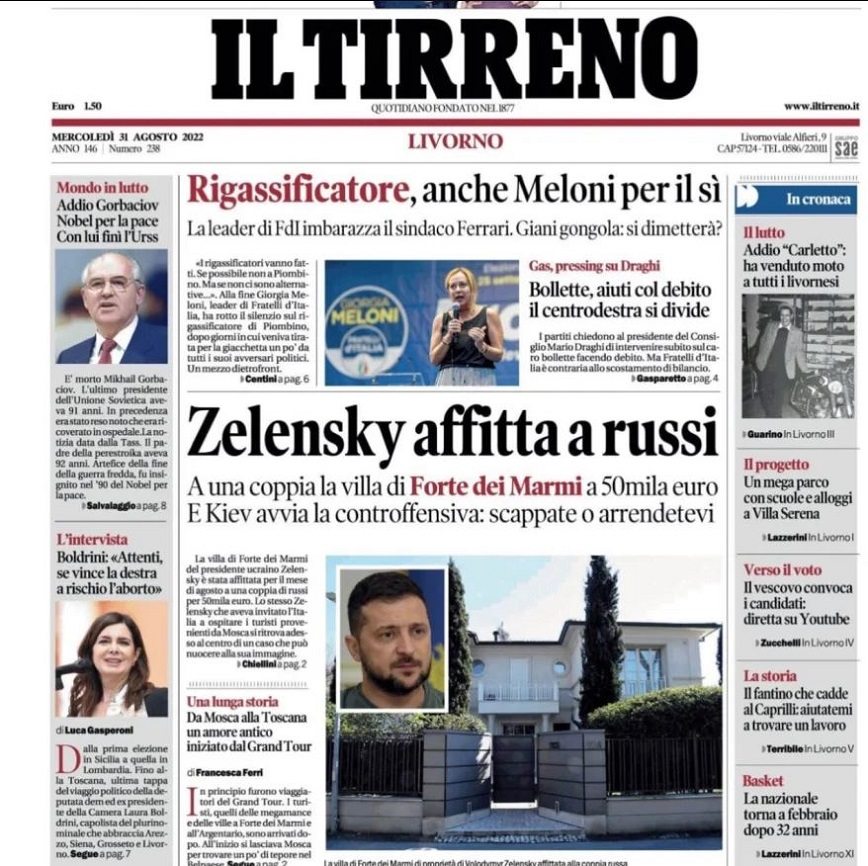 Σάλο προκάλεσε στην Ιταλία η εφημερίδα «Il Tirreno», γιατί σε δημοσίευμα της υποστήριξε ότι ο Βολοντίμιρ Ζελένσκι νοικιάζει βίλα που διατηρεί στη Τοσκάνη σε Ρώσους, την στιγμή που είναι σε εξέλιξη ο πόλεμος στην Ουκρανία.