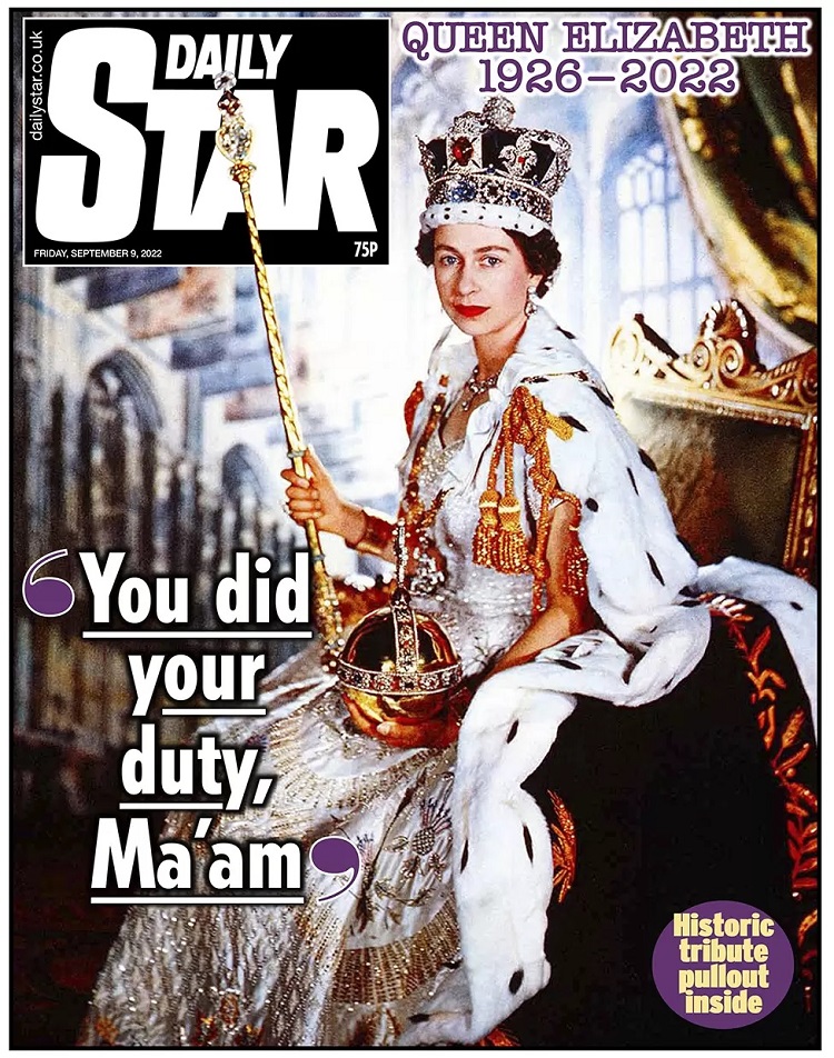 Από την πλευρά της, η «Daily Mirror» ευχαριστεί την βασίλισσα για όσα προσέφερε στο Ηνωμένο Βασίλειο. Η «Daily Star» διάλεξε τον τίτλο «Κάνατε το χρέος σας, κυρία», η «Daily Mail» «Οι καρδιές μας είναι ραγισμένες». Για την «Daily Express»: «Η αγαπημένη μας βασίλισσα είναι νεκρή». Όσο για τη «The Sun», έγραψε: «Σας αγαπήσαμε, κυρία μου».