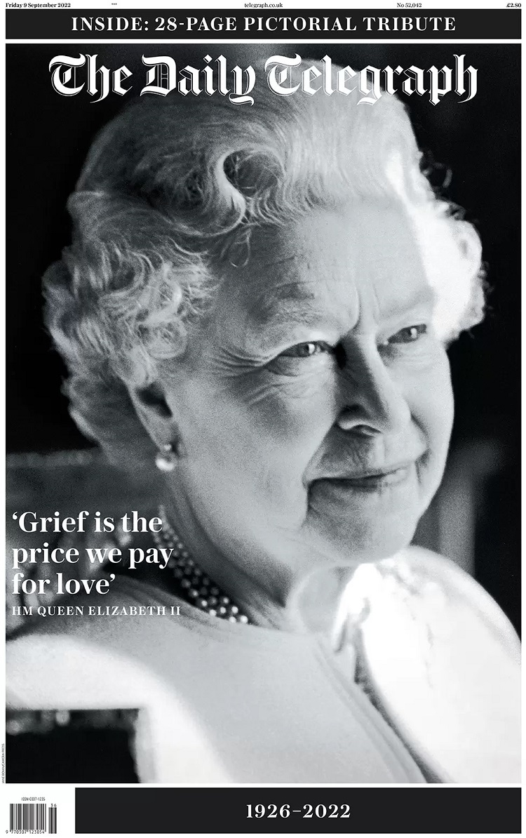 Η «Daily Telegraph» διάλεξε για τίτλο το απόφθεγμα της βασίλισσας Ελισάβετ «η θλίψη είναι το τίμημα που πληρώνουμε για την αγάπη».