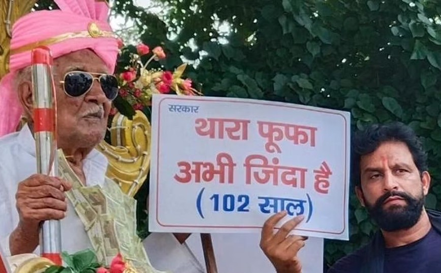 Για να αποδείξει στις αρχές, που δεν του χορηγούσαν πλέον τη σύνταξή του, ότι παρά τα 102 χρόνια του είναι ζωντανός, ένας Ινδός εμφανίστηκε με άμαξα, γαμπριάτικο κοστούμι και μια μπάντα στην έδρα της τοπικής κυβέρνησης.