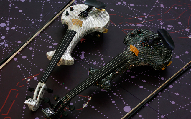 Το μουσικό ζευγάρι ποζάρει με τα ηλεκτρικά βιολιά του, τα οποία κοσμούν δεκάδες κρύσταλλοι.