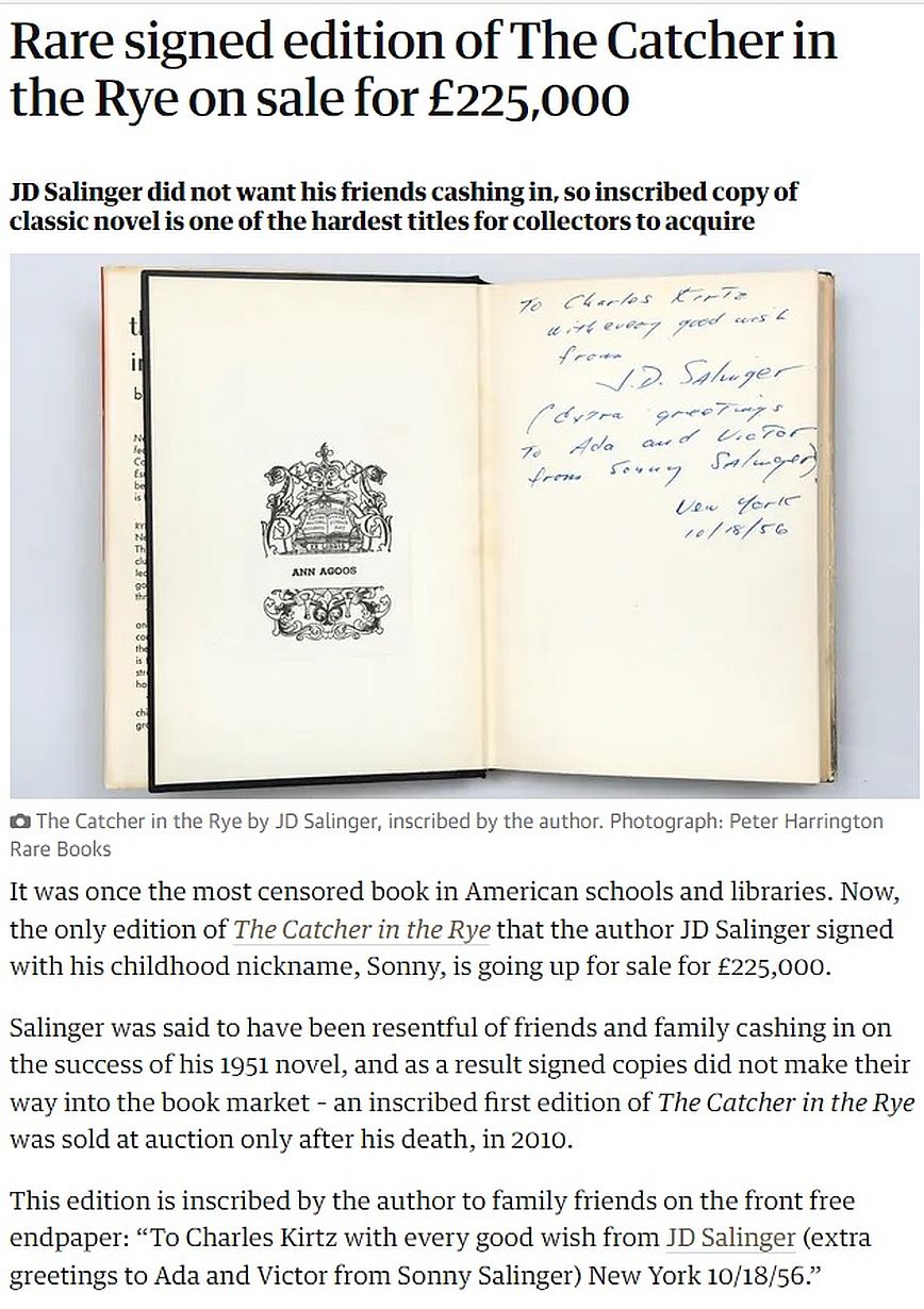 Λέγεται ότι ο Σάλιντζερ ήταν πικραμένος με τους φίλους και την οικογένειά του που εξαργύρωσαν την επιτυχία του μυθιστορήματός του που κυκλοφόρησε 1951 και ως αποτέλεσμα υπογεγραμμένα αντίτυπα του «The Catcher in the Rye» δεν διοχετεύθηκαν στην αγορά βιβλίου.