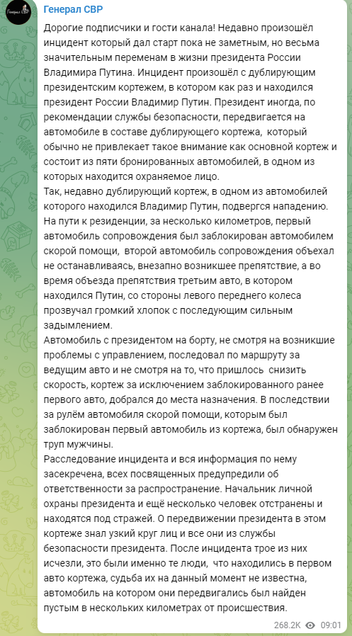 Σύμφωνα με τον λογαριασμό General SVR, το περιστατικό δεν έγινε σήμερα, ενώ ο πρόεδρος της Ρωσίας αναφέρεται ότι είναι καλά στην υγεία του.