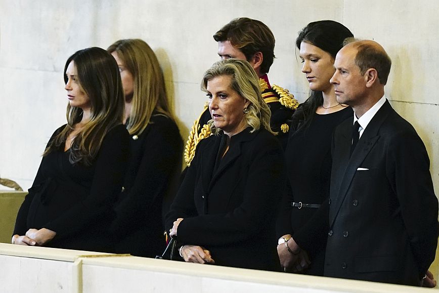 Τα εγγόνια της βασίλισσας Ελισάβετ στάθηκαν για 15 λεπτά με την πλάτη προς το φέρετρο και χαμηλωμένο το κεφάλι, υπό τα βλέμματα των επισκεπτών που έφθαναν για να αποτίσουν ύστατο φόρο τιμής στη σορό της Ελισάβετ Β’, η οποία θα παραμείνει εκτεθειμένη σε λαϊκό προσκύνημα μέχρι το πρωί της Δευτέρας.