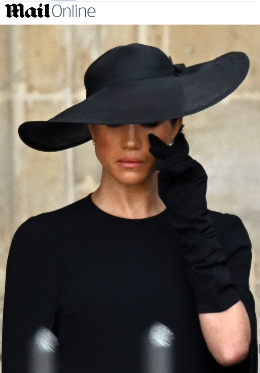 Σύμφωνα με την dailymail.co.uk, η Δούκισσα του Σάσεξ εμφανίστηκε να σκουπίζει τα δάκρυα που κύλησαν στο μάγουλό της, ενώ είχε σκυμμένο κεφάλι και φορούσε ένα μεγάλο μαύρο καπέλο.