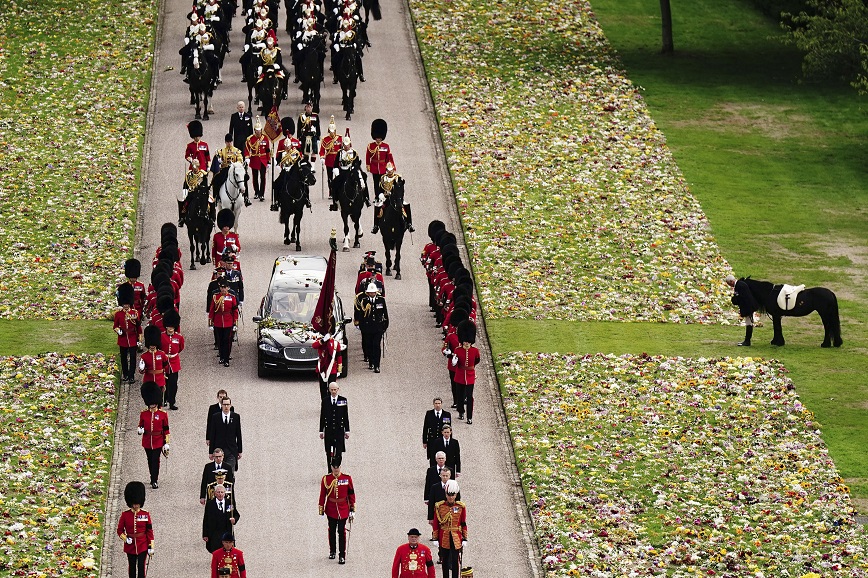 Επίσης, το μαύρο πόνι της βασίλισσας Ελισάβετ, η Έμμα, συνοδευόμενο από τον ιπποκόμο του, παρακολούθησε τη νεκρική πομπή να μπαίνει στο Κάστρο του Γουίνδσορ και να οδεύει στο παρεκκλήσι του Αγίου Γεωργίου.