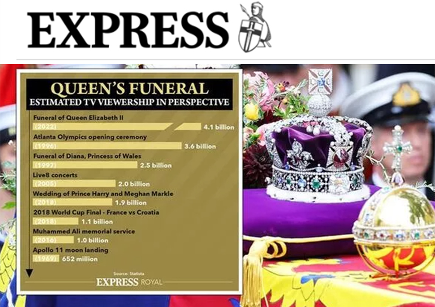 Όπως αναφέρει η express.co.uk, η κηδεία της Ελισάβετ ξεπέρασε σε τηλεθέαση παρά πολλά σημαντικά γεγονότα που έχουν προηγηθεί, καθώς υπολογίζεται πως την παρακολούθησαν περισσότερα από 4 δισεκατομμύρια άτομα.