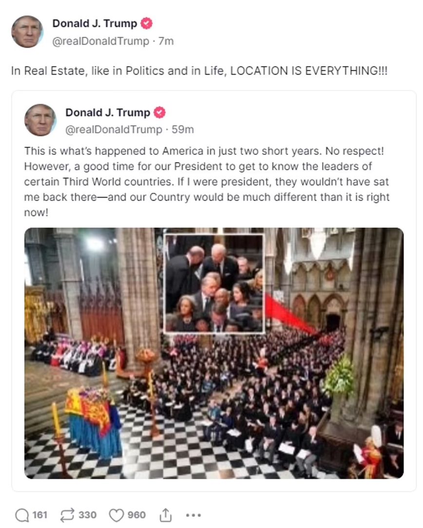Ο Τραμπ φυσικά δεν άφησε ασχολίαστη τη θέση του διαδόχου του. «Αυτό συνέβη στις ΗΠΑ μέσα σε μόλις δύο χρόνια. Κανένας σεβασμός. Ωστόσο ήταν μια ευκαιρία για τον Πρόεδρο να γνωρίσει τους ηγέτες ορισμένων κρατών του Τρίτου Κόσμου. Αν ήμουν εγώ πρόεδρος των ΗΠΑ δεν με έβαζαν εκεί πίσω και η χώρα μας θα ήταν πολύ διαφορετική από ό,τι είναι τώρα» ήταν οι αναρτήσεις του Ντόναλντ Τραμπ.