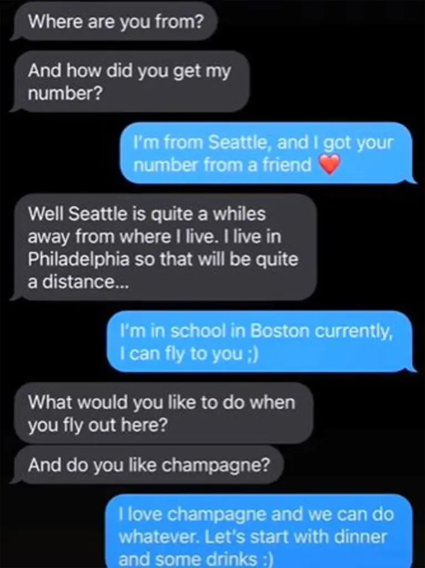 Έτσι, στο πρώτο μήνυμα που έστειλε έγραψε ότι «είμαι η μελλοντική σου φίλη», με τον πατέρα να απαντάει ότι «δεν είμαι σίγουρος πώς θα ένιωθε η γυναίκα μου για κάτι τέτοιο». «Είμαι στο σχολείο στη Βοστώνη αυτή τη στιγμή, μπορώ να πετάξω σε εσένα», του απάντησε στη συνέχεια, με τον διάλογο μεταξύ τους να εξελίσσεται.
