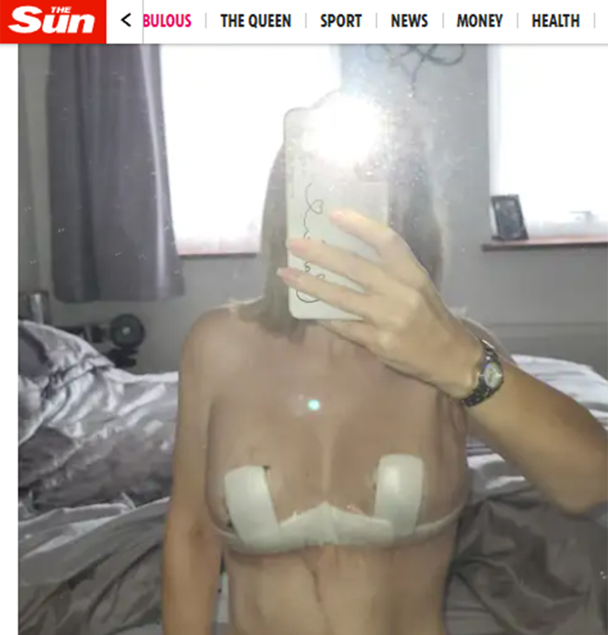 Έπειτα, πρόσθεσε ότι «ο πόνος συνεχίστηκε και τρομοκρατήθηκα όταν έβγαλα τους επιδέσμους μου. Είχα δύο εμφυτεύματα ψηλά, αλλά οι θηλές μου και το χαλαρό δέρμα μου κρέμονταν σαν μαστοί από κάτω. Τα είχαν κάνει τελείως μαντάρα στην επέμβαση. Ήμουν συντετριμμένη και αρνιόμουν να βγω από το σπίτι. Τηλεφώνησα στην κλινική, αλλά αρνήθηκαν να μου μιλήσουν».