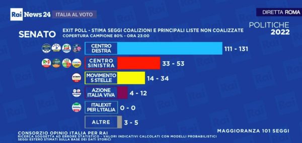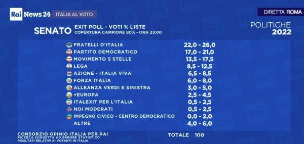 Σύμφωνα με αυτά το κόμμα «Αδέρφια της Ιταλίας», της Τζόρτζια Μελόνι, συγκεντρώνει 22-26% ενώ η Lega του Ματέο Σαλβίνι 8,5-12,5%. Το «Φόρτσα Ιτάλια» του Σίλβιο Μπερλουσκόνι συγκεντρώνει 6-8%. Τα ποσοστά των τριών κομμάτων συνολικά ανέρχονται σε 40,9%, έχοντας ξεκάθαρο προβάδισμα σύμφωνα με τις εκτιμήσεις των exit polls για να εξασφαλίσουν πλειοψηφία σε Κοινοβούλιο και Γερουσία.