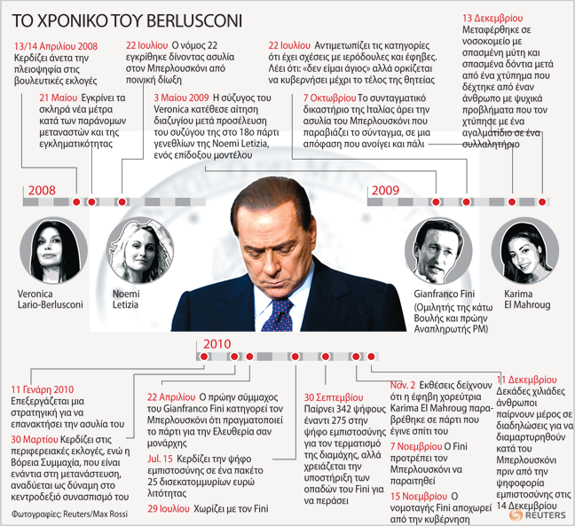 Μέσα σε αυτά τα χρόνια η θητεία του Σίλβιο σημαδεύτηκε από σκάνδαλα με εκρηκτικές χορεύτριες, νίκη σε περιφερειακές εκλογές και κατηγορίες για σχέσεις με ιερόδουλες και έφηβες. Στο παρακάτω γράφημα φαίνεται αναλυτικά η εξέλιξη της θητείας του Μπερλουσκόνι από το 2008 μέχρι σήμερα.
