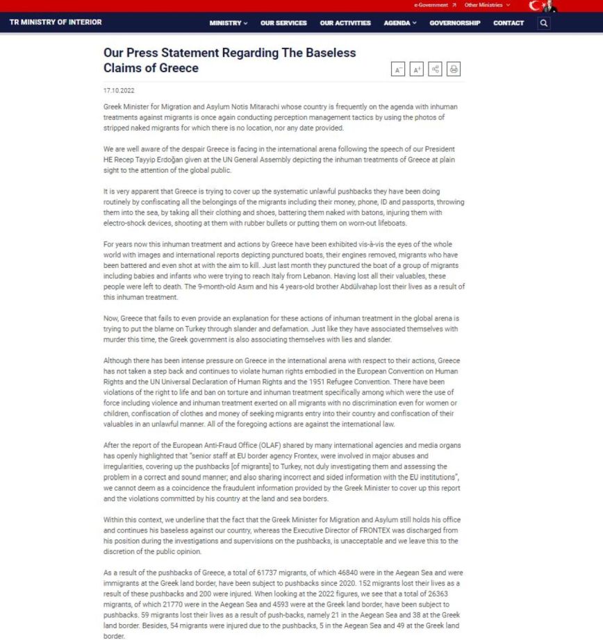 «Γνωρίζουμε καλά πόσο απελπισμένη είναι η Ελλάδα, μετά την ομιλία του Προέδρου μας, του Ρετζέπ Ταγίπ Ερντογάν που δόθηκε στη Γενική Συνέλευση του ΟΗΕ που απεικονίζει τις απάνθρωπες τακτικές της Ελλάδας. Είναι πολύ προφανές ότι η Ελλάδα προσπαθεί να καλύψει τις συστηματικές παράνομες απωθήσεις που κάνουν συστηματικά κατάσχοντας όλα τα υπάρχοντα των μεταναστών- συμπεριλαμβανομένων των χρημάτων, του τηλεφώνου, της ταυτότητας και των διαβατηρίων τους- πετώντας τους στη θάλασσα, παίρνοντας όλα τα ρούχα τους και παπούτσια, χτυπώντας τους γυμνούς με ρόπαλα, τραυματίζοντάς τους με συσκευές ηλεκτροσόκ, πυροβολώντας τους με σφαίρες από καουτσούκ ή βάζοντάς τους σε φθαρμένες σωσίβιες λέμβους», αναφέρει η ανακοίνωση του τουρκικού υπουργείου Εσωτερικών στη συνέχεια.