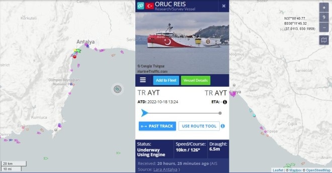 Κινητικότητα του τουρκικού ερευνητικού σκάφους «Oruc Reis» καταγράφει ο ιστότοπος Marinetraffic. Το στίγμα του σκάφους περίπου στις 22:30 της Τετάρτης (19/10) έδειχνε μετακίνηση από το λιμάνι της Αττάλειας, με ταχύτητα 10 κόμβων.