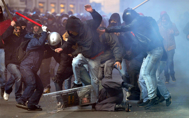 Ακολούθως, ακραίες ομάδες διαδηλωτών άρχισαν να πυρπολούν κάδους, να ρίχνουν μολότοφ και να ξηλώνουν τα «σανπιετρίνι» – ειδικές πέτρες – από τα πεζοδρόμια και να τα εκτοξεύουν προς τους αστυνομικούς.