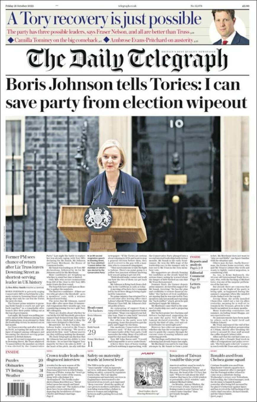 «Bojo: Επιστρέφω», είναι ο πρωτοσέλιδος τίτλος του βρετανικού ταμπλόιντ The Sun. Από τις υπόλοιπες συντηρητικές βρετανικές εφημερίδες, η Daily Telegraph εμφανίζει τον Μπόρις Τζόνσον ως εν δυνάμει «σωτήρα» των Τόρις από μία προαναγγελθείσα εκλογική πανωλεθρία. Τονίζει δε ότι ο εκπεσών πρώην πρωθυπουργός έχει τείνει κλάδο ελαίας στον πρώην υπουργό του των Οικονομικών Ρίσι Σουνάκ. Η Daily Mail αναδεικνύει στην πρώτη της σελίδα το ενδεχόμενο μονομαχίας ανάμεσα στους δύο άνδρες.