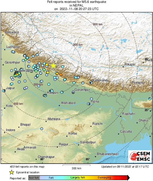 Το σεισμολογικό κέντρο του Νεπάλ υπολόγισε ότι η ισχύς του σεισμού ήταν 6,6 βαθμοί. Το Εθνικό Κέντρο Σεισμολογίας της Ινδίας ανέφερε πως ήταν 6,3. Το Ευρωμεσογειακό Σεισμολογικό Κέντρο (EMSC) και το αμερικανικό ινστιτούτο γεωλογικών μελετών (USGS) εκτίμησαν πως το μέγεθος της δόνησης ήταν 5,6 βαθμοί.