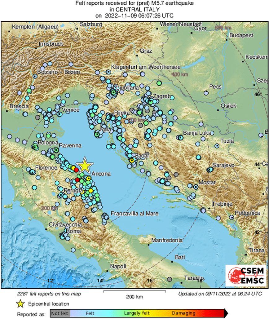 Ισχυρός σεισμός σημειώθηκε στην Ιταλία, με το Ευρωμεσογειακό Σεισμολογικό Ινστιτούτο (EMSC) να κάνει λόγο για δόνηση μεγέθους 5,7 βαθμών της κλίμακας Ρίχτερ.
